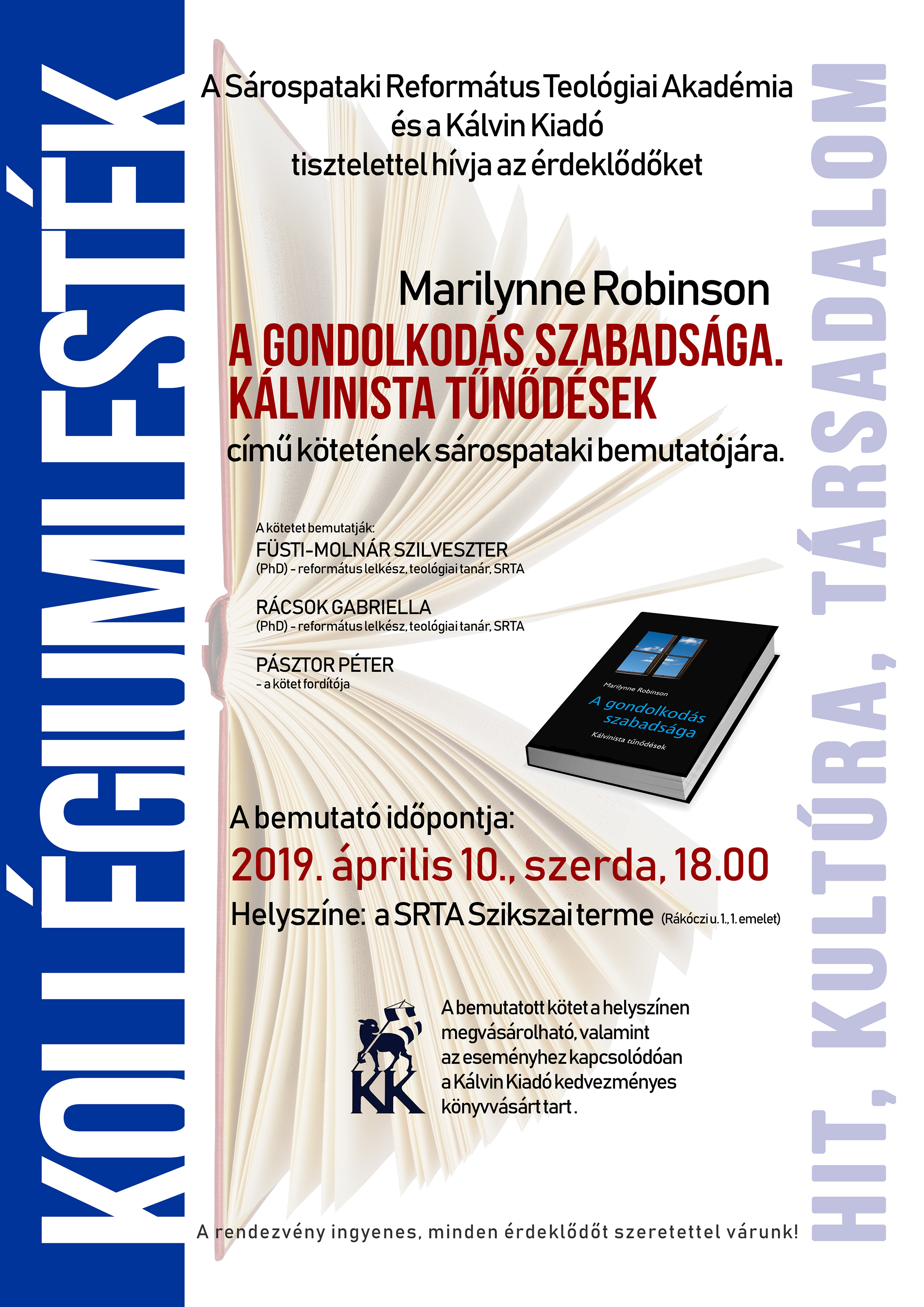 Marilynne Robinson: A gondolkodás szabadsága. Kálvinista tűnődések című kötetét 2019. április 10-én 18 órától az SRTA Kollégiumi esték sorozatába illeszkedve mutatjuk be. A könyvbemutatón részt vesz Pásztor Péter, a kötet fordítója, Rácsok Gabriella és Füsti-Molnár Szilveszter teológiai tanár.